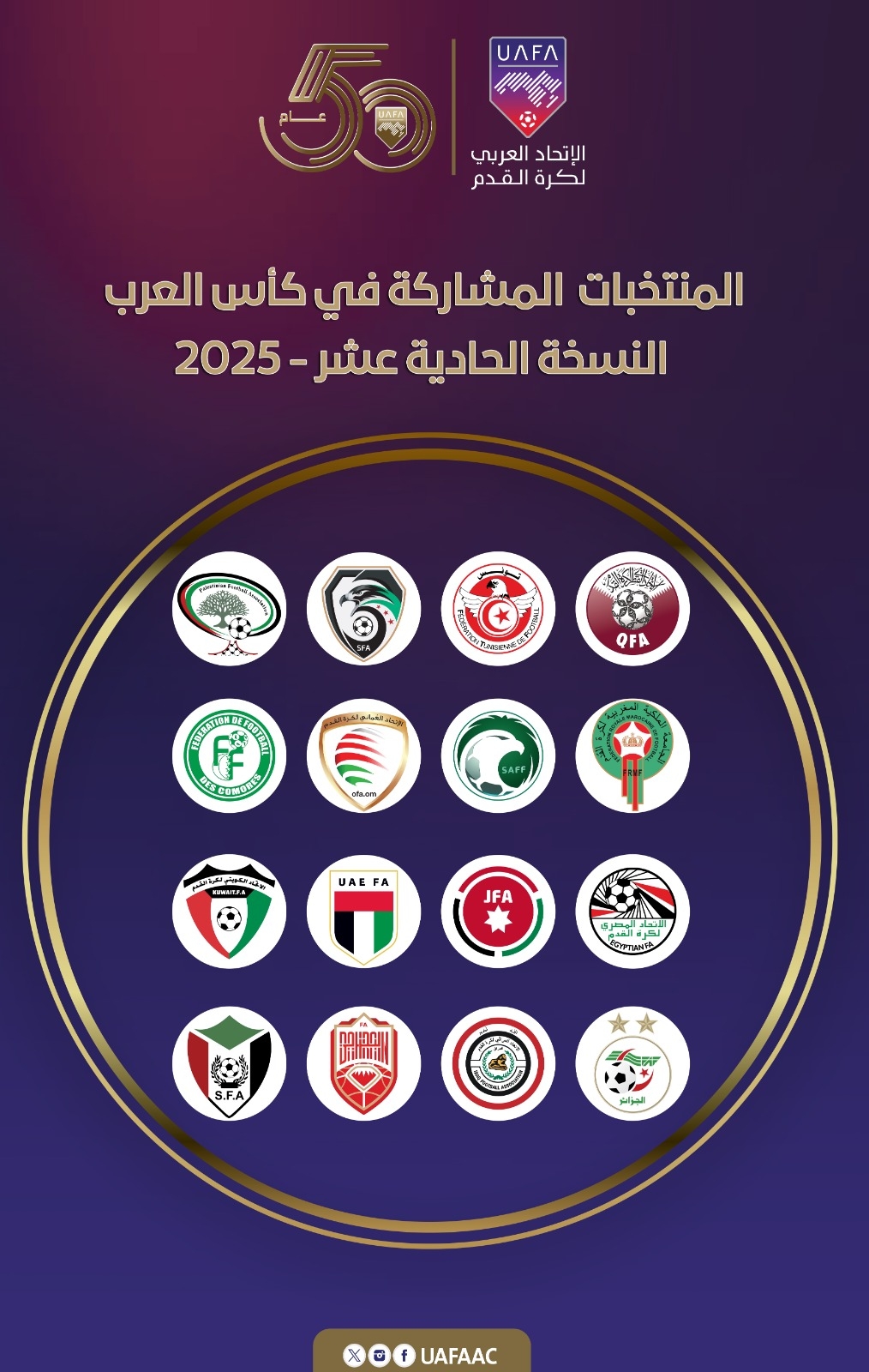 – المنتخبات المشاركة: الجزائر – تونس – المغرب – قطر – مصر – السعودية – العراق – ليبيا – الأردن – الإمارات – عمان – البحرين – الكويت – السودان – فلسطين – سوريا – لبنان – اليمن – الصومال – جيبوتي – موريتانيا – جزر القمر – جنوب السودان.