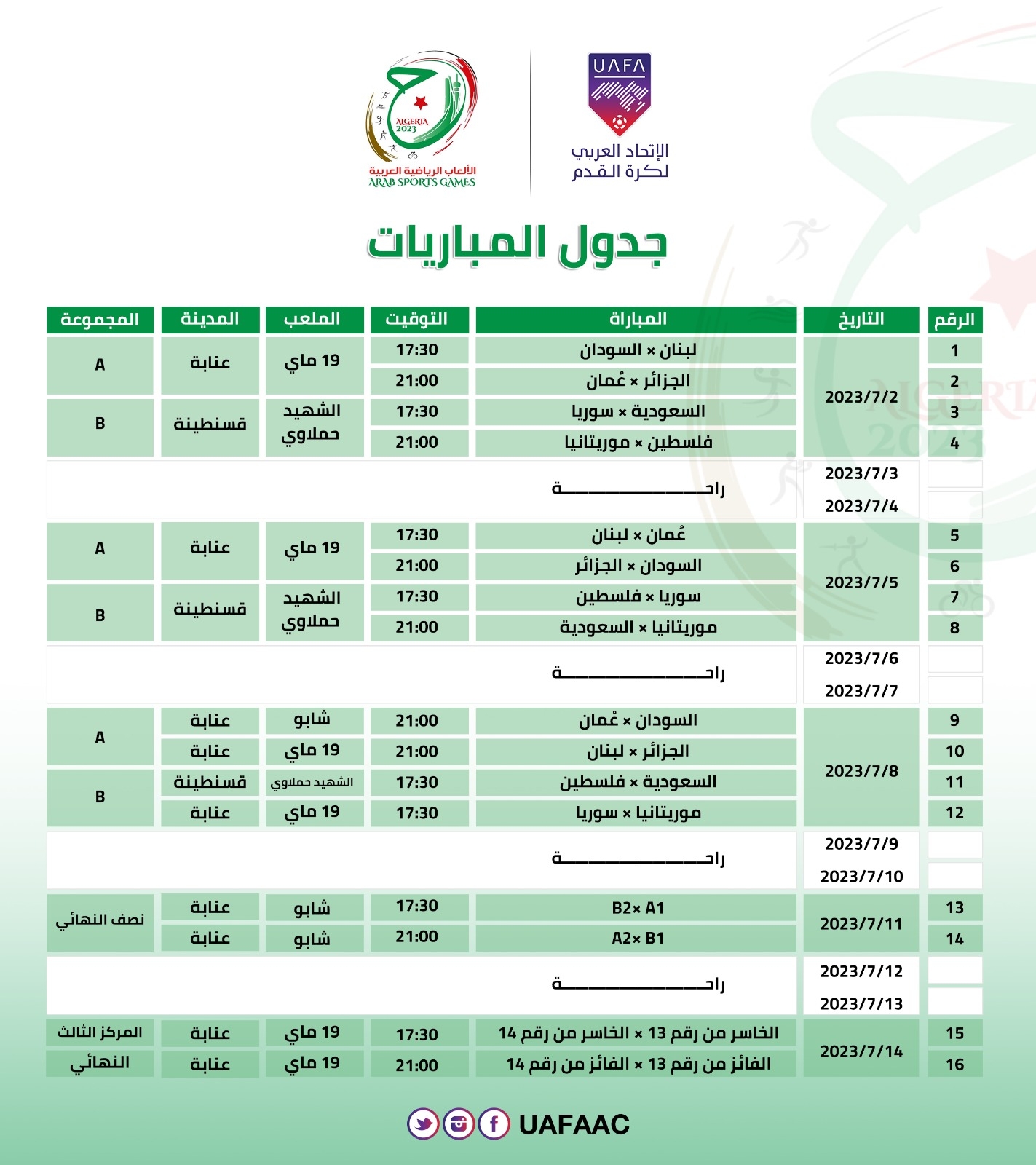 The football competitions of the fifteenth Pan Arab Games will be held in Algeria from 5 to 14 July 2023, with the participation of 8 teams, namely Algeria, Oman, Lebanon, Sudan, Saudi Arabia, Syria, Palestine and Mauritania, as the matches will be held in Annaba and Constantine.