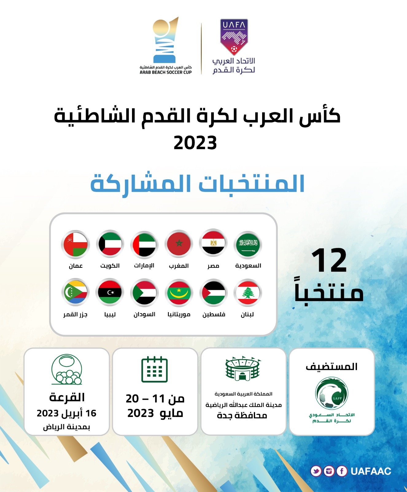 The Union of Arab Football Associations will organize the Arab Beach Soccer Championship in its fourth edition, which comes within its competitions for the 2023 season, and will be hosted by the Saudi Arabian Football Federation in Jeddah, Saudi Arabia, from May 11 to 20, in King Abdullah Sports City.
