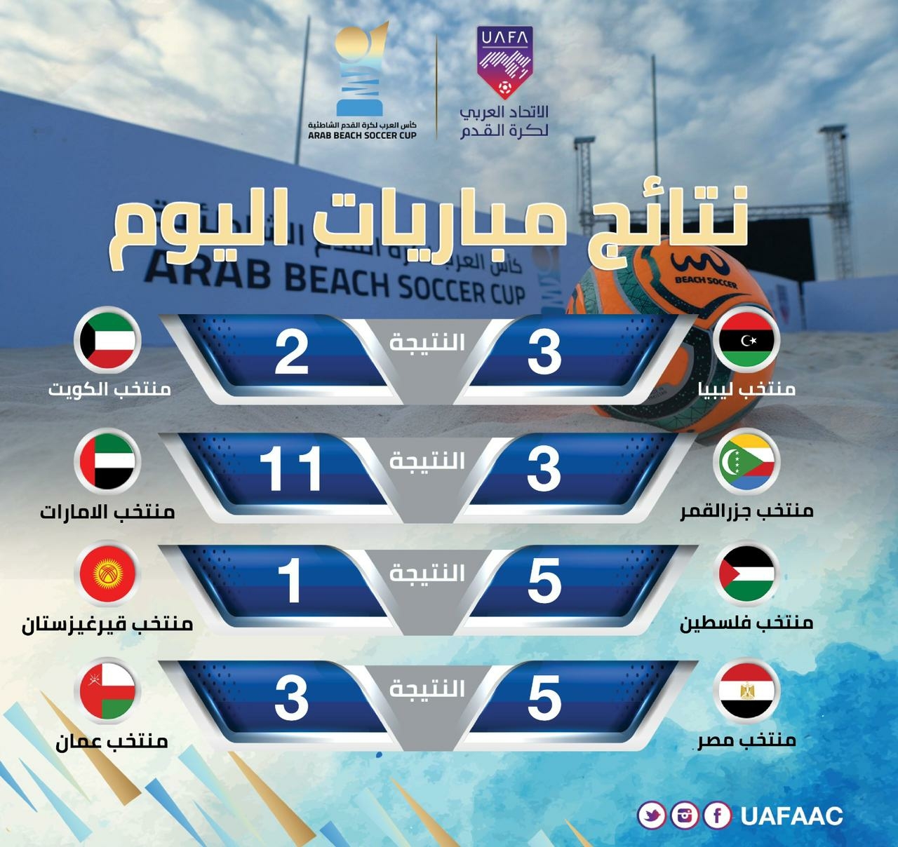 Four matches were held throughout the day, as the Libyan national team defeated Kuwait 3-2, UAE national team defeated Comoros 11-3, the Palestinian national team defeated Kyrgyzstan 5-1, and the Egyptian national team defeated Oman 5-3.